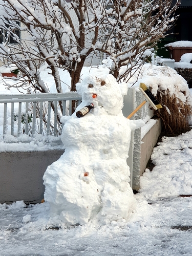 A follow up to yesterday’s snow covered tops, I give you a snowman and his inevitable demise. This year the traditional burning of a snowman to drive away winter has been cancelled due to you know what.