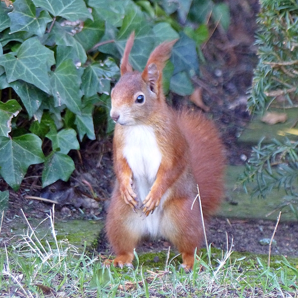 Above you see a squirrel doing a disappearing act. I could also say: Oben sehen Sie ein Eichhörnchen, wie es verschwindet.