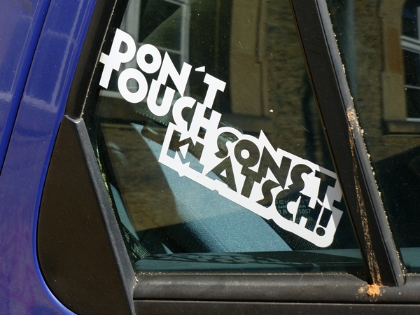I saw this on a car – translated it reads: Don’t touch – or else you’ll get slapped! Besides mixing languages it is very colloquial. And “klatsch” kind of rhymes with “touch”.