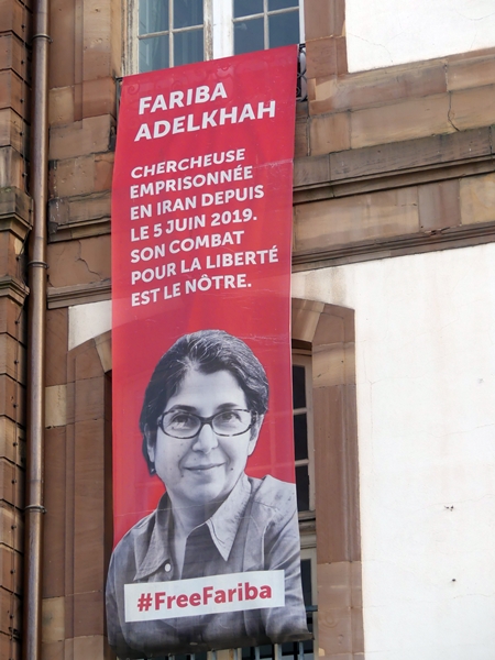 This banner is in support of Fariba Adelkhah who is currently detained in Iran. She lived in Strasbourg before she visited her native country of Iran and got arrested for spying and later convicted for conspiring against national security and for propaganda against the state. The banner is displayed on the front of the townhall of Strasbourg.