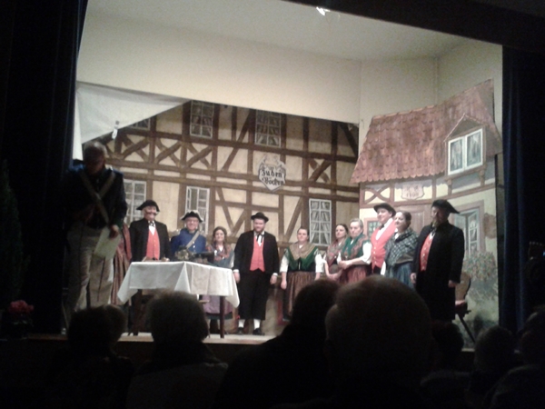 I normally don’t take photos during performances – it is too distracting – for me, for the audience and often for the actors on stage. However, I tried out my new cell phone to capture this picture (this is a few years back, it was my first mobile capable of photos and I was stunned what I could do without a flash). It was a performance by our local folklore society, usually a combination of mostly authentic costumes, a great painted backdrop (merely 50 years old), mediocre writing, bad acting, and worse singing. As you can probably tell, I myself am often a part of these proceedings (which makes it even more difficult to take photos).