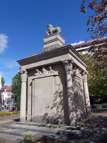 I came across this rather odd war memorial in Bad Dürkheim. It’s in memory of the participants of the Franco-Prussian war. The participants – not the fallen as is more common – are listed with their military regiment, and a curt “gefallen” if they didn’t return. Even worse, in my mind, is the use of the ditto mark ” – not just for the same regiment but also for the word “gefallen” as if in such a monumental glorification set in stone they had to economise with letters.