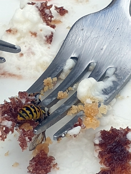We found this wonderful little place that serves amazing cakes and snacks. My husband and I were sensible (as befits our age) and shared a cheese sandwich. Our son and grandson ordered a “cake platter” – six pieces of creamy, spongey, fruity creations of cake. I can’t offer a photo because before I looked twice it was half gone. But as soon as they slowed down their fork movements, the yellowjacket marauders arrived. One wasp was the scout, he disappeared to fetch his friends, and any peace was gone.