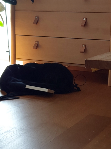 Our grandkid’s backpack has been lying in front of this sideboard for days (tidying is no one’s favourite around here). And now it has started to sprout fur.