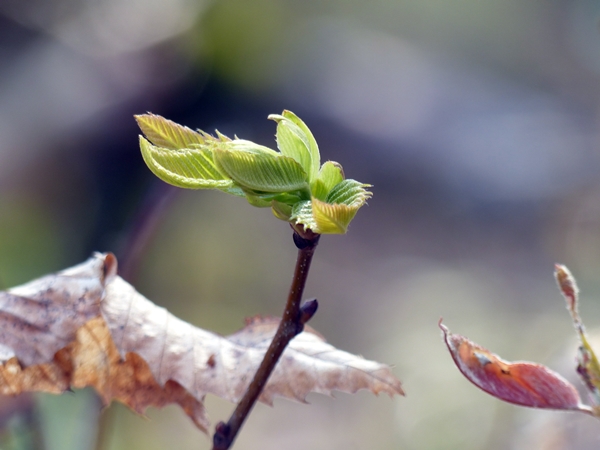 A barren twig in winter, the leaves burst out in spring.